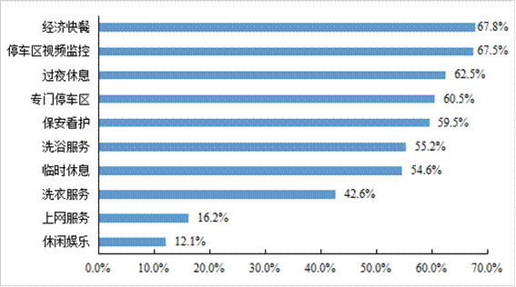 5.5 調查顯示,貨車司機希望在“司機之家”等司機休息區域享受到的服務占比依次為吃飯休息、停車監控、過夜休息、專門停車區、保安看護、洗浴服務、臨時休息、洗衣服務等配套服務,司機也希望享受上網服務、休閑娛樂等休閑服務。