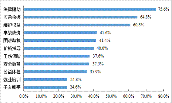 5.8 調查顯示,貨車司機希望社會組織提供的公共性服務中,排名第一的是維權類服務,法律援助和維護權益分別占比75.6%和60.8%都是貨車司機需求最大的公共服務。其次是救援類服務,應急救援服務需求占比64.8%,也是較為普遍的服務需求。第三是救濟類服務,事故救濟、困難幫扶等服務需求占比分別為41.6%和41.4%。第四是價監類服務,司機對價格指導需求較大,占到調查司機的40%。第五是社保類服務,37.6%的貨車司機希望能夠投保工傷保險。此外,安全教育、公益體檢、就業培訓等也是普遍需求的服務。
