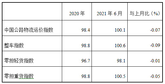 2021年6月份,由中國物流與采購聯合會和林安物流集團聯合調查的中國公路物流運價指數為100.1點,比上月回落0.07%,比去年同期增長1.6%。從各周指數看,第一、二、三周運價指數環比回落,第四周運價指數環比回升。