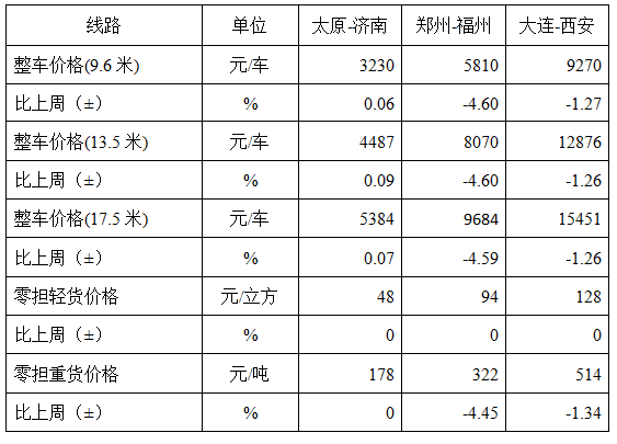 分車型看,各車型指數環比漲跌互現。其中,整車指數為1004.50點,比上周回落0.08%;零擔輕貨指數為981.22點,與上周持平;零擔重貨指數為1004.04點,比上周回落0.06%。