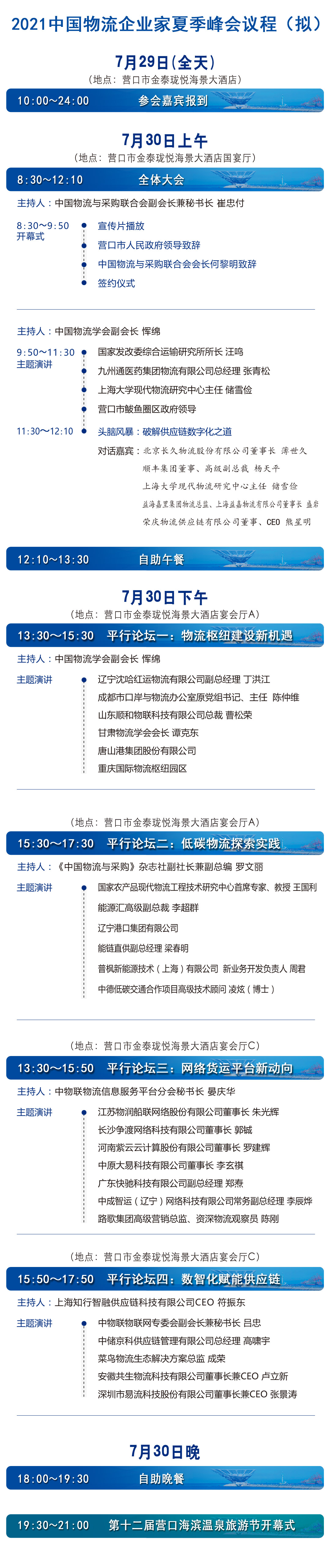 7月30日,“2021中國物流企業家夏季峰會”將在營口市召開。7月29日全天報到,目前會務組正在有條不紊的推進籌備工作。今天,峰會議程初步擬定,第一時間與參會嘉賓分享,更確切議程(含演講標題)預計將于7月23日發出。