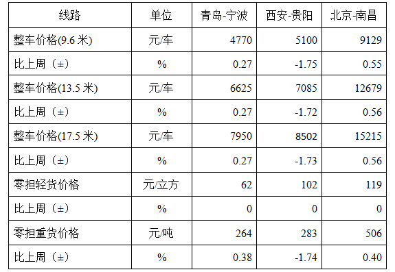 分車型看,各車型指數環比漲跌互現。其中,整車指數為1004.35點,比上周回落0.02%;零擔輕貨指數為981.20點,與上周持平;零擔重貨指數為1003.99點,比上周回落0.01%。