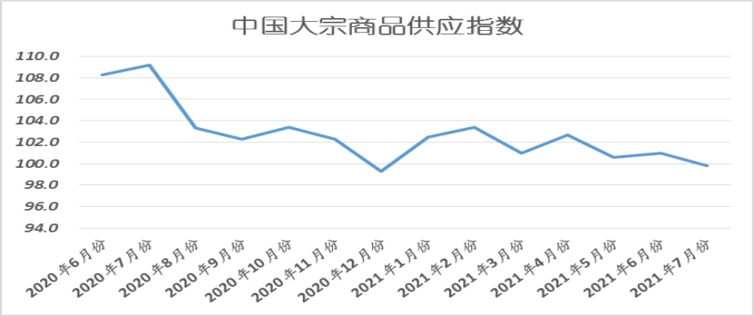 2021年7月份,大宗商品供應指數為99.8%,較上月回落1.2個百分點,指數跌至近七個月以來的最低,數據顯示持續增長半年的商品供應量開始出現下降。7月份以來,由于極端天氣頻發、環保停限產政策以及部分商品生產利潤下滑,國內大宗商品生產增速整體趨緩,部分訂單延后生產,商品供應開始下降。從各主要商品來看,因不同產業所受環保政策以及生產利潤不同的影響,各品種生產廠家開工率略有不同,加之進口情況復雜,導致各商品供應量增減出現明顯分化。本月鋼鐵、煤炭、化工和汽車供應量呈現下降態勢,特別是煤炭供應量已連續五個月呈現減少態勢,汽車供應量則連續三個月呈現下降格局,本月有色金屬供應量止跌回升,鐵礦石和成品油供應量則繼續增加。