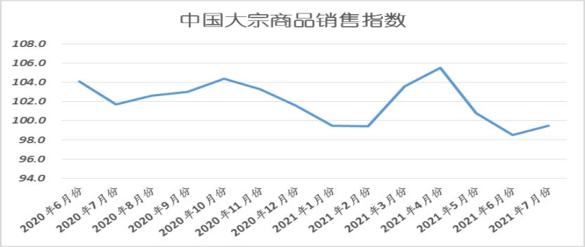 2021年7月份,大宗商品銷售指數為99.5%,指數較上月回升1.0個百分點。本月指數雖有回升,但只反映出銷售量的降幅有所收窄,市場需求仍未全面回暖。從市場情況來看,7月份,在極端天氣頻發的影響下,需求表現差強人意,淡季特征明顯。不過,進入8月份以后,需求端有望小幅回暖:一方面是資金面相對寬松,前期滯后的需求有望釋放;另一方面,高溫天氣緩解,下游消耗量有望增長。因此,市場對于8月份的需求抱有一定的期待。從各主要商品情況來看,煤炭、有色金屬和化工需求狀況良好,這也是拉動本月綜合指數回升的重要因素,成品油銷售量開始下滑,鋼鐵、鐵礦石和汽車銷售量則連續三個月下降。