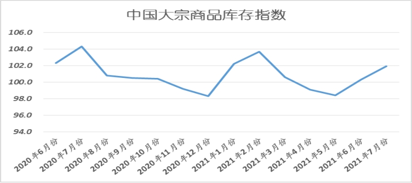 2021年7月份,大宗商品庫存指數繼續上升至101.9%,較上月上升1.6個百分點,數據顯示,進入7月份以來,雖在環保限產的影響下,生產企業開工率下降,商品供應開始下滑,但需求表現不及預期,商品庫存繼續積壓,庫存壓力仍在加大。從各主要商品庫存情況來看,本月除煤炭庫存繼續下降外,其余品種均呈現上升態勢,特別是鐵礦石和成品油庫存量止跌回升。