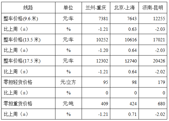 分車型看,各車型指數環比有所回落。其中,整車指數為1004.57點,比上周回落0.07%;零擔輕貨指數為981.19點,與上周基本持平;零擔重貨指數為1004.27點,比上周回落0.09%。