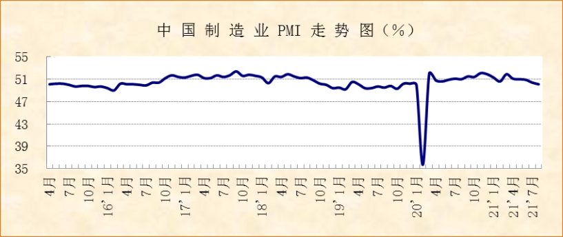 中國物流與采購聯(lián)合會、國家統(tǒng)計局服務(wù)業(yè)調(diào)查中心發(fā)布的2021年8月份中國制造業(yè)采購經(jīng)理指數(shù)(PMI)為50.1%,較上月下降0.3個百分點,連續(xù)5個月下降,已經(jīng)接近50%的臨界點,顯示制造業(yè)增速放緩。分項指數(shù)顯示,淡季和疫情影響顯現(xiàn),市場需求回落,企業(yè)生產(chǎn)和采購增速放緩。9月份市場需求或有回升空間,當(dāng)前原材料成本壓力依然較大和企業(yè)對后市預(yù)期有所下降值得關(guān)注。四季度應(yīng)著力化解市場需求壓力,強(qiáng)化經(jīng)濟(jì)增長動力。