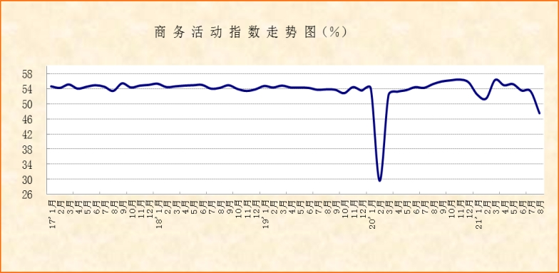 中國(guó)物流與采購(gòu)聯(lián)合會(huì)、國(guó)家統(tǒng)計(jì)局服務(wù)業(yè)調(diào)查中心發(fā)布的2021年8月份中國(guó)非制造業(yè)商務(wù)活動(dòng)指數(shù)較上月下降5.8個(gè)百分點(diǎn)至47.5%;新訂單指數(shù)較上月下降7.5個(gè)百分點(diǎn)至42.2%。指數(shù)變化顯示,非制造業(yè)市場(chǎng)供需較上月明顯下降。在供需下降的影響下,非制造業(yè)終端銷售價(jià)格和就業(yè)活動(dòng)均有不同程度下滑。銷售價(jià)格指數(shù)和從業(yè)人員指數(shù)較上月均有下降。分行業(yè)看,受疫情影響,生活消費(fèi)相關(guān)服務(wù)業(yè)受到明顯沖擊,是拖累本月非制造業(yè)增速下降的主要因素。建筑業(yè)和金融業(yè)活動(dòng)相對(duì)穩(wěn)定。