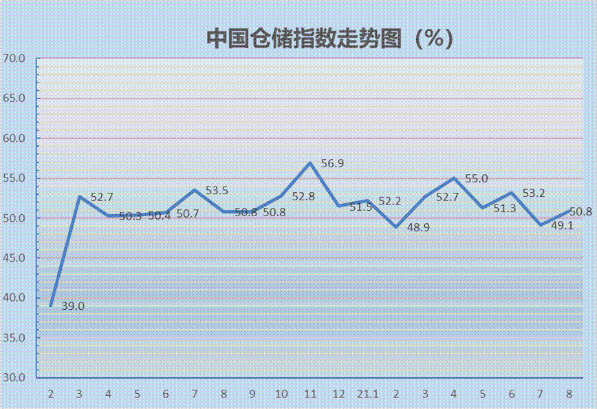中國(guó)物流與采購(gòu)聯(lián)合會(huì)與中儲(chǔ)發(fā)展股份有限公司聯(lián)合調(diào)查的中國(guó)倉(cāng)儲(chǔ)指數(shù),2021年8月份為50.8%,較上月回升1.7個(gè)百分點(diǎn)。各分項(xiàng)指數(shù)中,企業(yè)員工指數(shù)與上月持平,其余指數(shù)均有不同程度的回升。