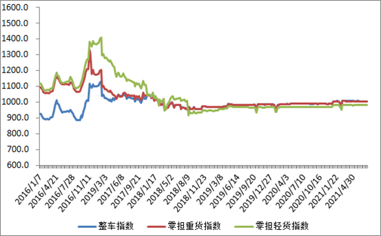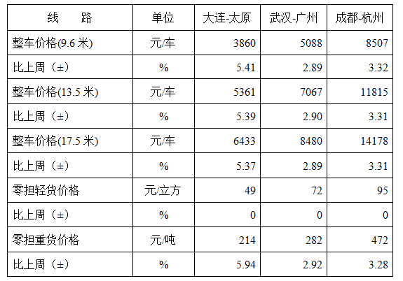 分車型看,各車型指數環比漲跌互現。其中,整車指數為1005.81點,比上周回升0.12%;零擔輕貨指數為981.11點,比上周回落0.01%;零擔重貨指數為1005.49點,比上周回升0.12%。