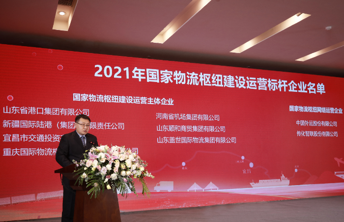 山東省港口集團有限公司黨委常委、副總經理馬德亮代表國家物流樞紐聯盟理事長霍高原講話。國家發展改革委經濟貿易司副處長楊浩哲發布了《2021年國家物流樞紐建設運營標桿企業名單》,山東省港口集團有限公司、新疆國際陸港(集團)有限責任公司、宜昌市交通投資有限公司、重慶國際物流樞紐園區建設有限責任公司、河南省機場集團有限公司、山東順和商貿集團有限公司、山東蓋世國際物流集團有限公司、中國外運股份有限公司、傳化智聯股份有限公司共9家企業入選。張江波、賀登才與標桿企業的代表合影留念。國家物流樞紐聯盟技術支持單位中國外運股份有限公司直屬運易通科技有限公司技術總監楚寧志對建設中的國家物流樞紐綜合信息服務平臺服務功能進行了介紹。