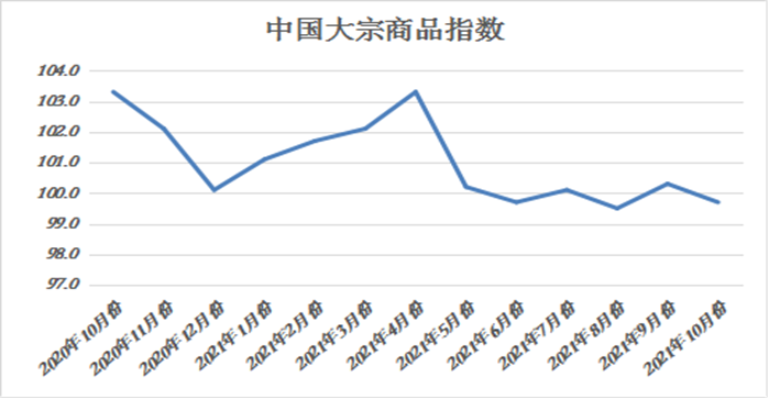 由中國物流與采購聯合會調查、發布的2021年10月份中國大宗商品指數為99.7%,該指數在上月小幅反彈后,本月再度回落,顯示國內大宗商品市場的下行壓力加大。各分項指數中,供應指數、銷售指數和庫存指數均有所回落。從本月指數的變化情況來看,多地限產政策逐步落實,供給端收縮給市場帶來一定的提振,但終端需求旺季不旺,不及預期,出現增速回落,特別是國內電力、煤炭等能源價格較快上漲,也在提高企業的原材料采購和生產成本,抑制需求,需求不足的矛盾導致市場進一步調整。進入11月份,北方進入冬季,需求強度將會繼續減弱,加之目前國內經濟增速有所放緩,不確定性上升,因此,我們認為大宗商品市場仍將面臨較大的調整風險。