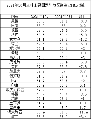 2021年10月全球主要國家制造業PMI