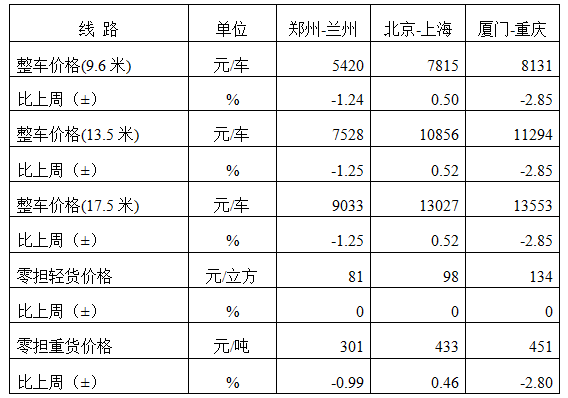 表1 本周部分線路平均價格及環(huán)比情況對比