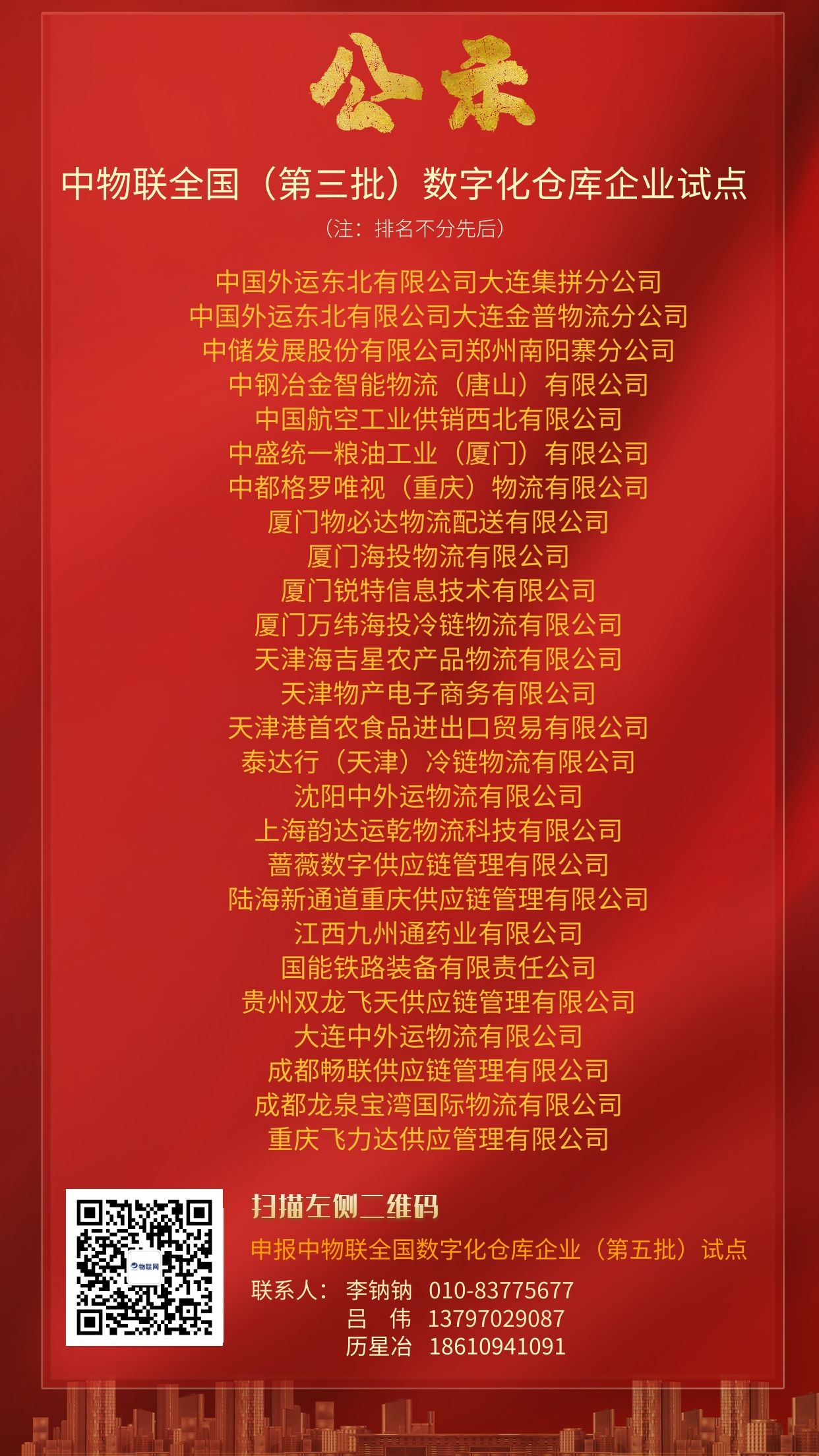 中物聯(lián)全國(guó)(第三批)數(shù)字化倉(cāng)庫(kù)企業(yè)試點(diǎn)企業(yè)名單