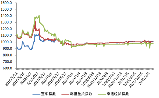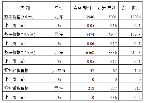 分車型看,各車型指數總體較為平穩(wěn)。其中,整車指數為1008.26點,與上周基本持平;零擔輕貨指數為983.67點,與上周基本持平;零擔重貨指數為1005.96點,比上周回落0.01%。