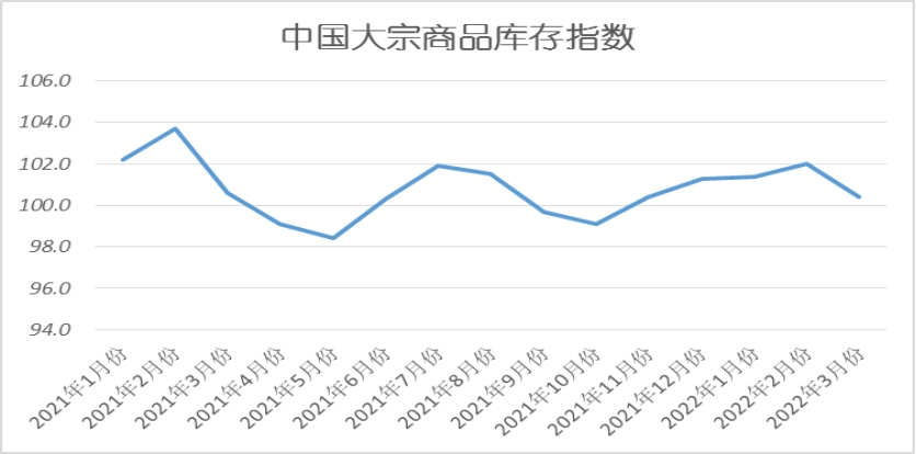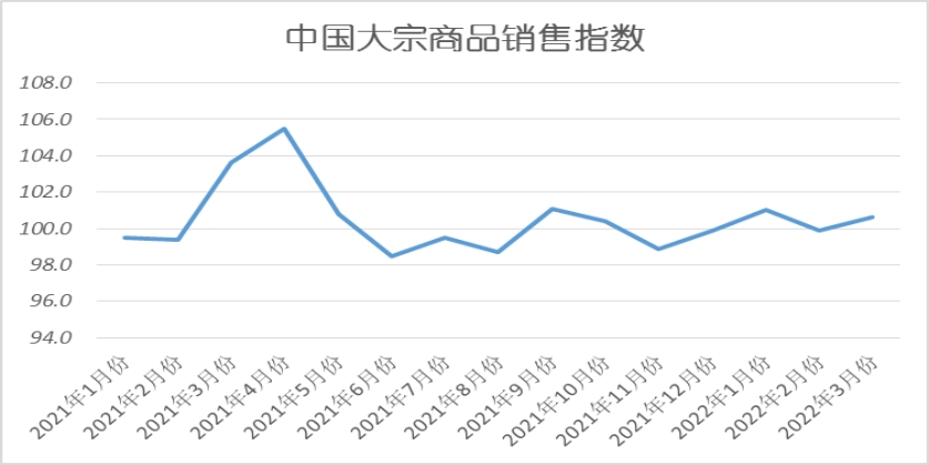 2022年3月份,大宗商品銷售指數止跌回升,至100.6%,顯示隨著傳統旺季的來臨,帶動了國內需求增加,商品成交量開始上升,但隨著疫情再度多點爆發,特別是3月下旬,各地管控措施升級,對商品流通和終端需求的影響開始加大,加之房地產行業復蘇較慢,終端需求回暖速度未如預期,下游需求逐漸陷入低谷。各主要商品中,鋼鐵和鐵礦石銷售量止跌回升,這也是拉動本月銷售指數回升的重要因素,化工銷售量繼續增加,但增速放緩,煤炭、成品油、有色金屬和汽車銷售量則出現不同程度的下降。