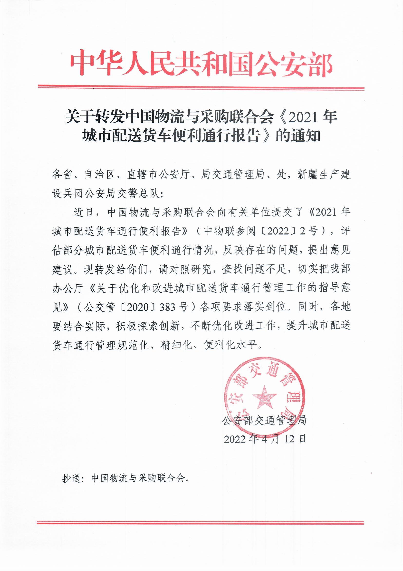 公安部交管局轉發(fā)中國物流與采購聯合會《2021年城市配送貨車便利通行報告》