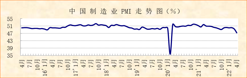中國物流與采購聯(lián)合會、國家統(tǒng)計局服務(wù)業(yè)調(diào)查中心發(fā)布的2022年4月份中國制造業(yè)采購經(jīng)理指數(shù)(PMI)為47.4%,較上月下降2.1個百分點,為2020年3月以來最低水平,經(jīng)濟下行壓力加大。從分項指數(shù)和行業(yè)PMI變化來看,國內(nèi)疫情多點散發(fā)和國際地緣政治沖突等短期因素的影響仍在持續(xù),對物流和就業(yè)沖擊較大,原材料價格持續(xù)高漲,制造業(yè)三重壓力加大,中上游行業(yè)增速回落明顯。但高技術(shù)制造業(yè)和消費品制造業(yè)相對穩(wěn)定,中小型企業(yè)穩(wěn)定性有所鞏固。