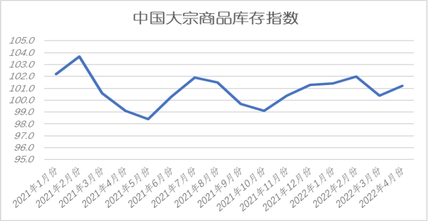 2022年4月份,大宗商品庫存指數止跌回升,當月較上月回升0.8個百分點,至101.2%,顯示在國內大宗商品市場“供需雙弱”的背景下,加之疫情影響,商品流通持續受限,導致當前大宗商品庫存繼續積壓,市場“去庫存化”難度較大。各主要商品中,除鐵礦石受到貨量減少有所減少外,其余品種均呈現增加態勢。