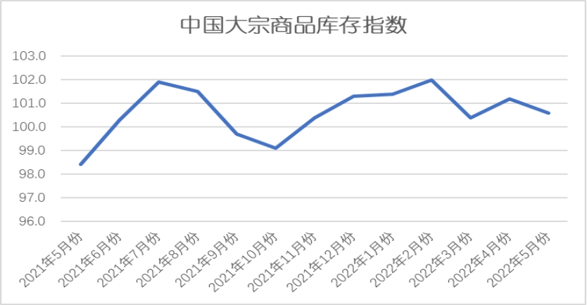 2022年5月份,大宗商品庫存指數為100.6%,較上月回落0.6個百分點,顯示隨著需求端修復性反彈,國內大宗商品市場庫存增速有所減緩,商品庫存壓力出現緩解。不過,整體來看,國內大宗商品市場庫存量已連續七個月呈現上升態勢,只是各月增速有所變化,顯示當前國內大宗商品市場整體供庫存仍在積壓,商品去庫存的難度較大。各主要商品中,除鐵礦石庫存量繼續減少外,其余品種均呈現增長態勢。