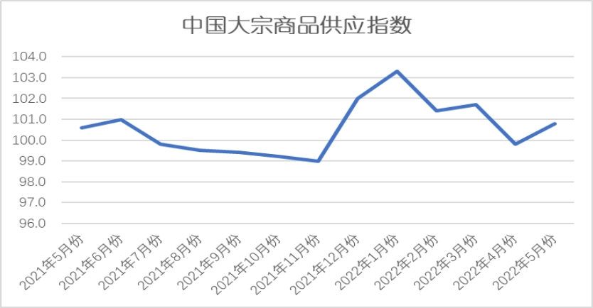 2022年5月份,大宗商品供應指數止跌回升,當月較上月回升1.0個百分點,至100.8%,顯示隨著物流保通保暢政策措施和紓困助企措施同步發力,貨運物流趨于通暢在一定程度上緩解了原材料供給緊張,加上保供穩價工作持續取得成效,生產企業復工復產逐漸增多,產品產量開始回升,商品供應得到保障。各主要商品中,鐵礦石和汽車供應量觸底回升,煤炭供應增速繼續加快,鋼鐵供應增速減緩,成品油、有色金屬和化工供應量則繼續下降。