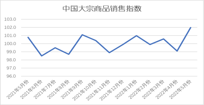 2022年5月份,大宗商品銷售指數止跌回升,至102.0%,指數反彈至2021年5月份以來的最高點,表明穩增長、保民生多項政策效果開始顯現,市場需求正在修復,商品銷售局面活躍,企業訂單組織逐步順暢。各主要商品中,本月各商品銷售量全部上升,其中鋼鐵、煤炭、有色金屬、化工和汽車銷售量均為止跌回升,鐵礦石和成品油銷售量繼續增加,且增速加快。