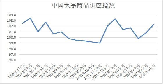 2022年6月份,大宗商品供應(yīng)指數(shù)為102.3%,較上月上升1.5個(gè)百分點(diǎn)。供應(yīng)指數(shù)連續(xù)兩個(gè)月呈現(xiàn)上升走勢(shì),且升至近五個(gè)月以來(lái)的高點(diǎn)。本月指數(shù)繼續(xù)上升,我們認(rèn)為一方面雖鋼鐵等商品生產(chǎn)虧損嚴(yán)重,企業(yè)生產(chǎn)積極性下降,但隨著疫情得到有效控制,商品物流逐漸恢復(fù),大部分生產(chǎn)企業(yè)預(yù)期向好,商品產(chǎn)量整體上升,加之部分商品進(jìn)口量增加,令市場(chǎng)供應(yīng)繼續(xù)增加;另一方面,也是由于之前基數(shù)較低,也是本月指數(shù)回升的重要因素。從各主要商品情況來(lái)看,本月除鋼鐵行業(yè)受虧損影響出現(xiàn)供應(yīng)下降外,其余品種均呈現(xiàn)供應(yīng)增加的局面,特別是成品油、有色金屬和化工供應(yīng)量,受其余復(fù)工復(fù)產(chǎn)增加的影響,供應(yīng)量止跌回升。