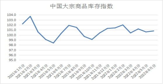 2022年6月份,大宗商品庫(kù)存指數(shù)繼續(xù)上升,當(dāng)月較上月上升0.2個(gè)百分點(diǎn),至100.8%,顯示隨著供應(yīng)增速加快,需求增速緩慢,商品庫(kù)存開(kāi)始增加,庫(kù)存壓力有所加大。各主要商品中,鐵礦石庫(kù)存量受需求減弱的影響,止跌回升,成品油庫(kù)存量增速加快,煤炭、有色金屬和化工庫(kù)存量增速有所減緩,鋼鐵和汽車庫(kù)存量由升轉(zhuǎn)降。