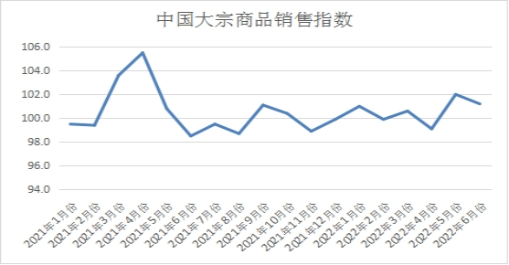 2022年6月份,大宗商品銷售指數(shù)為101.2%,較上月回落0.8個(gè)百分點(diǎn),顯示國(guó)內(nèi)大宗商品市場(chǎng)銷售增速出現(xiàn)減緩。從各主要商品的情況來(lái)看,鐵礦石受鋼鐵行業(yè)減產(chǎn)影響較大,本月銷售量降幅明顯,其余品種雖銷售繼續(xù)增加,但各品種受終端需求整體恢復(fù)狀況各有差異的影響,銷售增速出現(xiàn)分化。