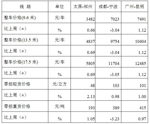 分車型看,各車型指數環比均小幅回升。其中,整車指數為1039.04點,比上周回升1.32%;零擔輕貨指數為1032.90點,比上周回升1.27%;零擔重貨指數為1038.79點,比上周回升1.32%。