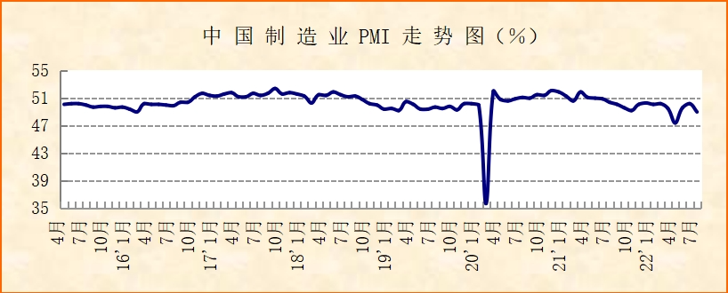 中國物流與采購聯合會、國家統計局服務業調查中心發布的2022年7月份中國制造業采購經理指數(PMI)為49%,較上月下降1.2個百分點,在連續2個月環比上升后再次下降,且落入50%以下,表明經濟運行受多地高溫多雨短期季節性影響有所波動。分項指數變化顯示,7月市場需求有所回落,企業生產經營活動放緩。但企業成本壓力明顯下降,就業保持相對穩定,新動能仍保持上升勢頭。當前需要重點關注市場需求不足問題,防范外部市場風險沖擊。
