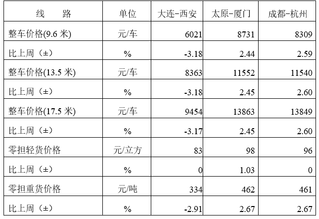 分車型看,各車型指數環比漲跌互現。其中,整車指數為1025.74點,比上周回落0.31%;零擔輕貨指數為1026.82點,比上周回升0.02%;零擔重貨指數為1025.51點,比上周回落0.3%。