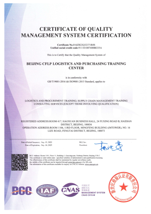 近日,北京中物聯物流采購培訓中心(以下簡稱北京中物聯)通過了ISO9001質量管理體系認證,認證范圍包括物流、采購培訓、供應鏈管理培訓咨詢服務等。北京中物聯是首個通過ISO9001質量管理體系認證的國家級行業協會培訓中心,這標志著北京中物聯在物流、采購與供應鏈培訓認證領域的管理體系上達到了國際標準,在質量管理、系統建設和規范化管理等方面取得了新進展。未來北京中物聯將繼續為行業提供更好的培訓認證產品與服務。