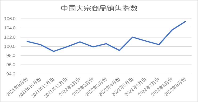2022年9月份,大宗商品銷售指數較上月上升1.8個百分點,至105.4%,指數升至2021年5月份以來的最高點,顯示隨著傳統旺季來臨,終端用戶備貨積極,市場銷售情況向好,企業訂單組織逐步順暢,本月國內大宗商品銷售量增速較上月有所加快。各主要商品中,本月各商品銷售量繼續呈現全部上升的局面,且增速均有所加快。