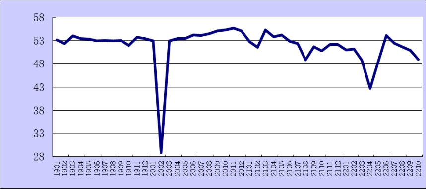 2022年10月份綜合PMI產出指數為49%