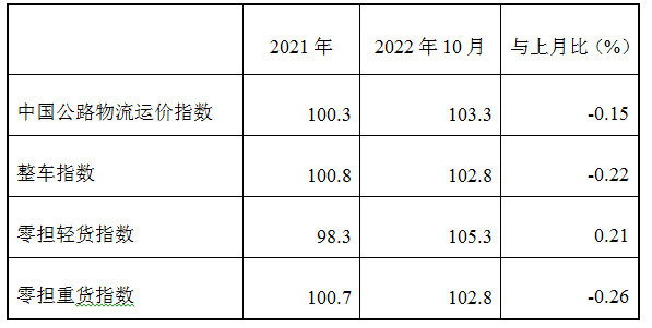 2022年10月份,由中國物流與采購聯合會和林安物流集團聯合調查的中國公路物流運價指數為103.3點,比上月回落0.15%,比去年同期增長3%。從周指數看,第一、三周運價指數環比回落,第二、四周運價指數環比回升。