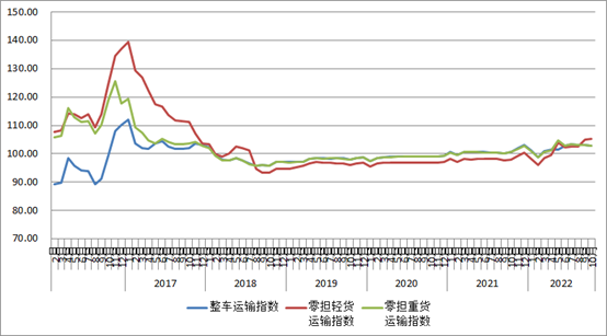 分車型指數看,各車型指數環比漲跌互現,同比去年繼續保持小幅增長。以大宗商品及區域運輸為主的整車指數為102.8點,比上月回落0.22%,比上年同期增長2%。零擔指數中,零擔輕貨指數為105.3點,比上月回升0.21%,比上年同期增長7.3%;零擔重貨指數為102.8點,比上月回落0.26%,比上年同期增長2.1%。
