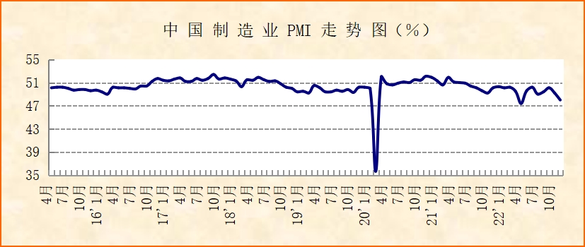 中國物流與采購聯合會、國家統計局服務業調查中心發布的2022年11月份中國制造業采購經理指數(PMI)為48%,較上月下降1.2個百分點,連續2個月下降,也是今年以來的次低點。分項指數變化顯示,三重壓力有所加大,市場價格趨于下降,產業鏈上下游同步放緩,大中小企業均承壓運行。結合當前國內形勢來看,疫情多點頻發,經濟運行壓力加大。但部分行業仍有較好表現,部分民生相關細分行業保持穩中有升,高技術制造業和消費品制造業出口需求也止跌回穩。