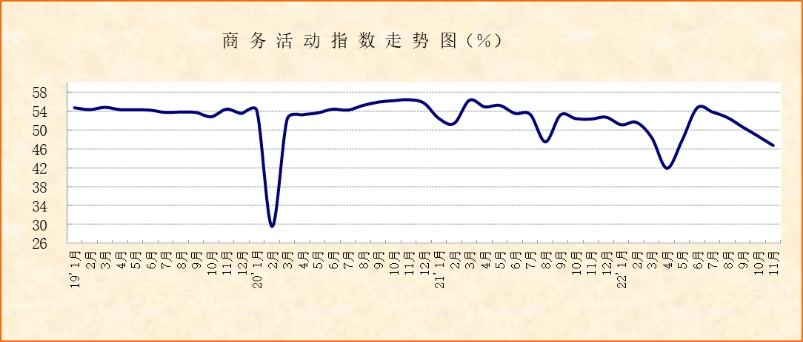 中國物流與采購聯合會、國家統計局服務業調查中心發布的2022年11月份中國非制造業商務活動指數為46.7%,較上月下降2個百分點,連續5個月環比下降,連續2個月運行在50%以下;新訂單指數為42.3%,較上月下降0.5個百分點,連續3個月環比下降,連續5個月運行在50%以下。綜合指數變化,11月份,在疫情波及面逐步擴大的影響下,非制造業供需下行壓力進一步加大。商務活動指數和新訂單指數均創出2022年以來的次低點,指數略好于2022年4月份。