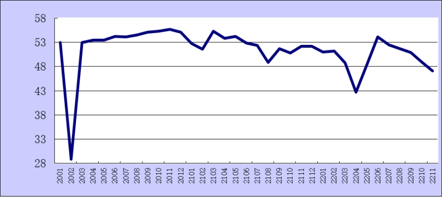 中國物流與采購聯(lián)合會(huì)、國家統(tǒng)計(jì)局服務(wù)業(yè)調(diào)查中心采購經(jīng)理調(diào)查發(fā)布的2022年11月份綜合PMI產(chǎn)出指數(shù)為47.1%,較上月下降1.9個(gè)百分點(diǎn)。該指數(shù)是PMI指標(biāo)體系中反映當(dāng)期全行業(yè)(制造業(yè)和非制造業(yè))產(chǎn)出變化情況的綜合指數(shù),由制造業(yè)生產(chǎn)指數(shù)與非制造業(yè)商務(wù)活動(dòng)指數(shù)加權(quán)求和而成,權(quán)數(shù)分別為制造業(yè)和非制造業(yè)占GDP的比重。