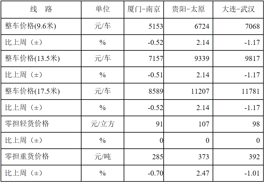 表1 本周部分線路平均價格及環(huán)比情況對比