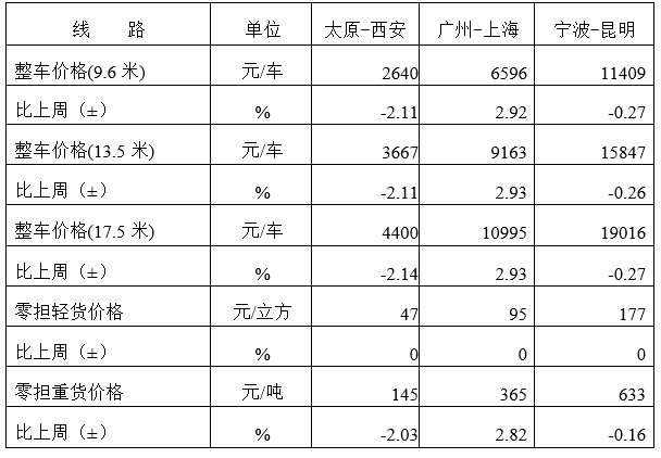 分車型看,各車型指數環比漲跌互現。其中,整車指數為1026.64點,比上周回升0.01%;零擔輕貨指數為1048.85點,比上周回落0.01%;零擔重貨指數為1025.45點,比上周回落0.11%。