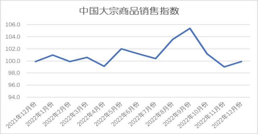 2022年12月份,大宗商品指數(shù)為99.9%,商品銷售量連續(xù)兩個月呈現(xiàn)下降態(tài)勢,顯示需求季節(jié)性趨弱情況較為明顯,加之部分地區(qū)疫情加重,病例增多,又進(jìn)一步影響了市場需求,終端企業(yè)采購越發(fā)趨于謹(jǐn)慎,市場訂貨積極性仍在降低,成交繼續(xù)減弱,商品生產(chǎn)企業(yè)訂單組織壓力進(jìn)一步加大。本月上半月,在政策面不斷釋放利好的提振下,需求端保持一定韌性,其中投機(jī)需求也有介入;下半月,隨著工地陸續(xù)收尾,疊加疫情因素蔓延,導(dǎo)致市場提前休市,整體成交快速回落。從各主要商品情況來看,鋼鐵、煤炭和有色金屬等商品受季節(jié)性因素影響較大,銷售量減少,鐵礦石、成品油和汽車銷售量則止跌回升,化工銷售增速和上月持平。