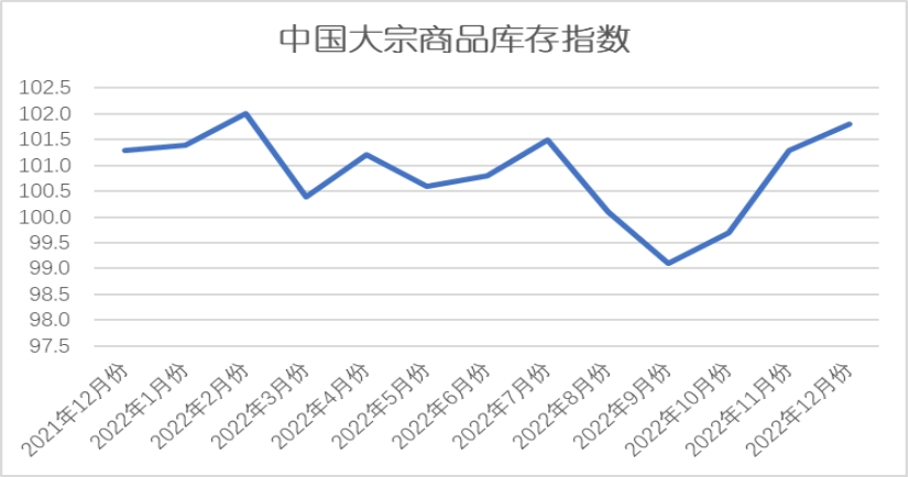 2022年12月份,大宗商品庫存指數(shù)繼續(xù)上升,至101.8%,較上月上升0.5個百分點(diǎn),為近十個月以來的最高點(diǎn),顯示隨著商品供應(yīng)量明顯增加,終端需求難以快速、有效地消化供應(yīng)增量,商品繼續(xù)累庫,庫存壓力進(jìn)一步加大。各主要商品中,除鐵礦石庫存量有所下降外,其余品種均呈現(xiàn)上升態(tài)勢,但增速略有不同。