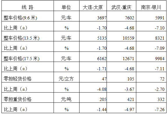 分車型看,各車型指數(shù)環(huán)比較快回落。其中,整車指數(shù)為1025.39點(diǎn),比上周回落2.68%;零擔(dān)輕貨指數(shù)為1020.80點(diǎn),比上周回落2.50%;零擔(dān)重貨指數(shù)為1025.10點(diǎn),比上周回落2.67%。