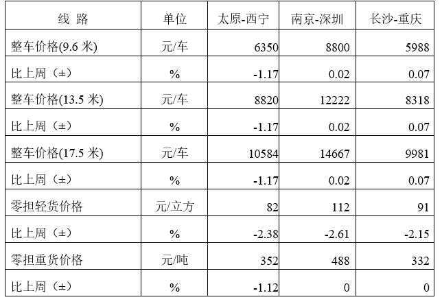 分車型看,各車型指數環比略有回升。其中,整車指數為1027.63點,與上周基本持平;零擔輕貨指數為1020.66點,比上周回升0.02%;零擔重貨指數為1027.34點,比上周回升0.02%。