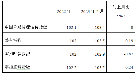 2023年3月份,由中國物流與采購聯(lián)合會和林安物流集團聯(lián)合調(diào)查的中國公路物流運價指數(shù)為103.4點,與上周基本持平,比去年同期增長3.1%。從周指數(shù)看,第一、二周運價指數(shù)環(huán)比回升,第三周運價指數(shù)環(huán)比回落,第四、五周運價指數(shù)總體平穩(wěn)。