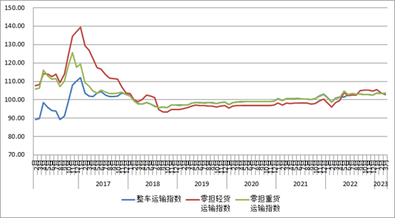 分車型指數(shù)看,各車型指數(shù)環(huán)比漲跌互現(xiàn),同比去年保持增長。以大宗商品及區(qū)域運輸為主的整車指數(shù)為103.5點,比上月回升0.19%,比上年同期增長2.7%。零擔指數(shù)中,零擔輕貨指數(shù)為102.9點,比上月回落0.87%,比上年同期增長4.6%;零擔重貨指數(shù)為103.5點,比上月回升0.24%,比上年同期增長2.9%。