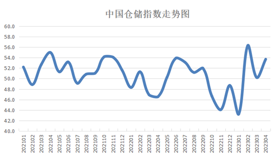 中國物流與采購聯合會和中儲發展股份有限公司聯合調查的中國倉儲指數,2023年4月份為53.7%,較上月上升3.5個百分點,連續三個月位于榮枯線之上,表明倉儲行業保持較好復蘇節奏。新訂單、延伸業務量、期末庫存、平均庫存周轉次數、企業員工等主要分項指數均有不同程度回升,且均位于榮枯線之上,同時業務活動預期指數繼續保持高位水平,反映出行業需求回升,業務活動活躍,商品流通更加順暢,企業信心繼續增強,補庫備貨積極。具體來看,本月指數有以下幾個特點: